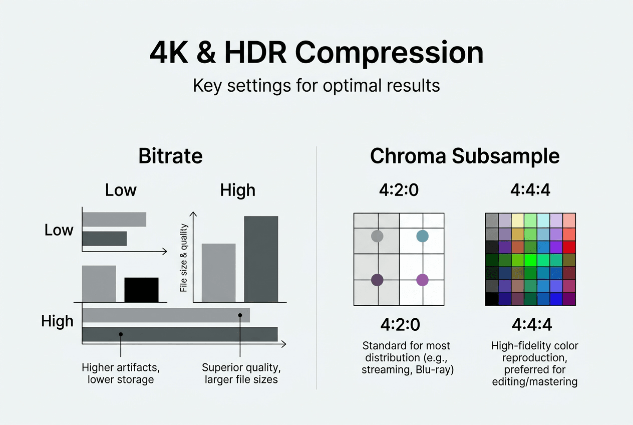 H.264 offers universal compatibility but requires larger files for 4K quality. H.265 doubles compression efficiency and handles HDR, making it ideal for modern workflows. AV1 provides the highest compression but encodes slowly and needs recent devices for hardware decoding. Choose H.264 for maximum compatibility, H.265 for balanced efficiency in 2026, or AV1 when storage savings justify longer encoding times.