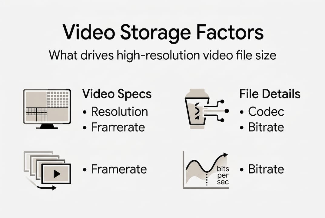 Before you can fix a storage problem, you need to understand what is actually creating it. File size is not just about resolution. It is a product of four variables working together: resolution, codec, bitrate (measured in megabits per second, or Mbps), and duration. Change any one of them and your storage math changes completely.