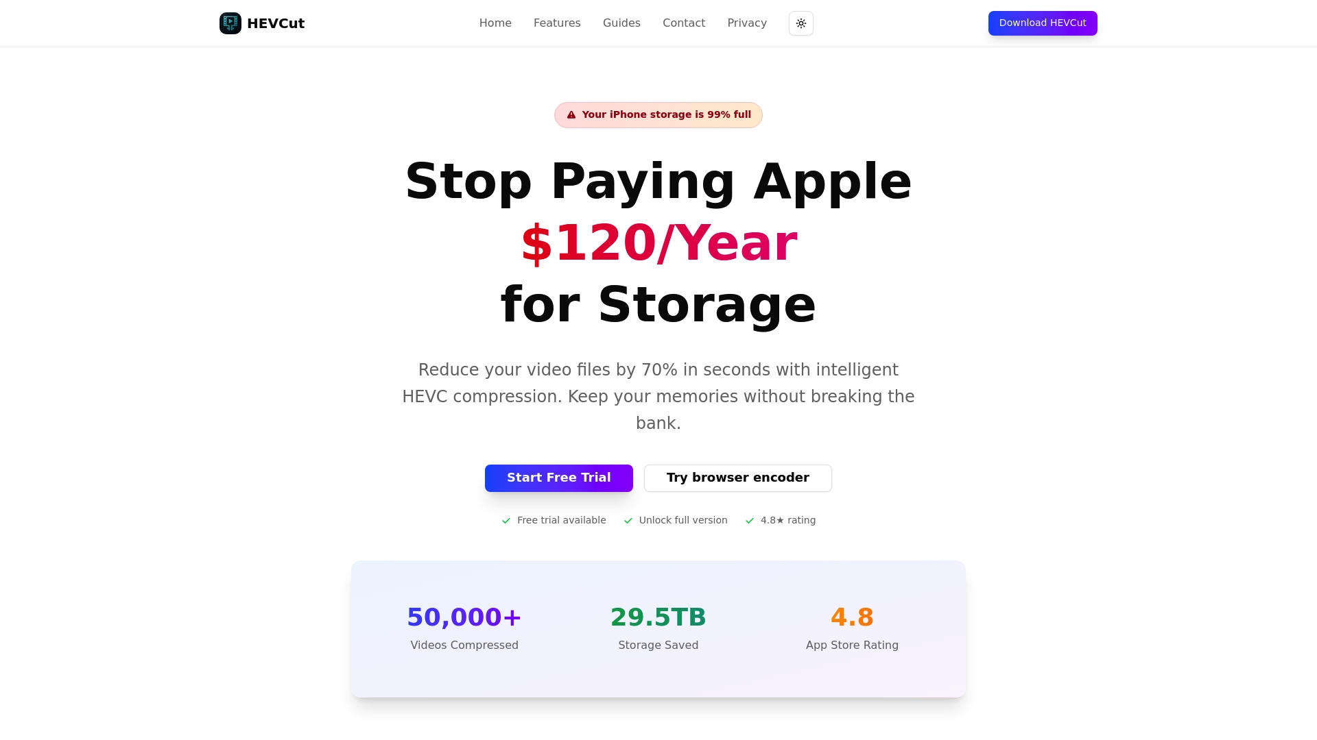 You deserve a smarter way to take charge of your storage. HEVCut.com uses advanced HEVC compression technology—from the same strategies highlighted in our efficient video compression guide—to help you shrink even your largest video files by up to 70%. You keep perfect HD quality, skip the clutter, and avoid unnecessary spending.