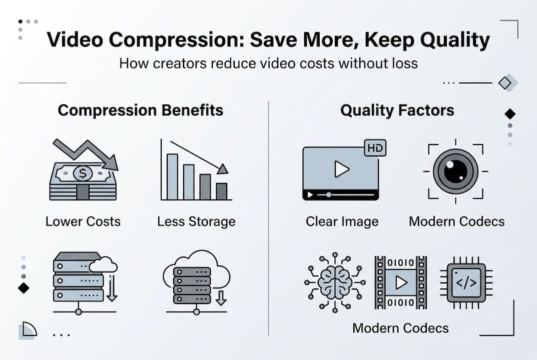 You're uploading your latest 4K shoot, and your cloud storage bill just jumped again. Most creators focus on gear, editing software, and distribution costs, but storage costs up 70% when you're storing large, uncompressed video files. The good news is that video compression can slash those bills dramatically, and modern codecs do it without touching the visual quality your audience expects. This guide walks you through the real numbers, the math behind the savings, and exactly how to put compression to work in your workflow.