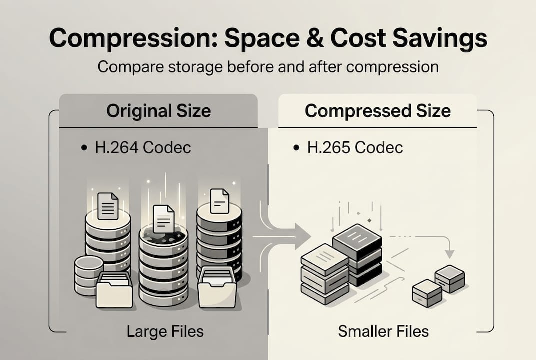 You can typically cut storage usage and costs by 50% or more using efficient compression like H.265. This translates to hundreds or thousands of dollars in annual savings depending on your video volume.